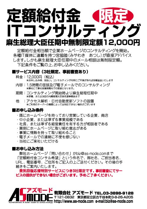 定額給付金相当額で企業ホームページのコンサルティングを開始。各種IT媒体に連載を持つ宮脇睦(みやわき あつし)が直接アドバイスします。しかも麻生総理大臣任期中のメール相談は無制限定額。